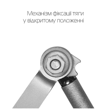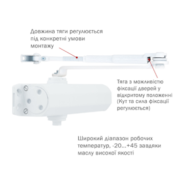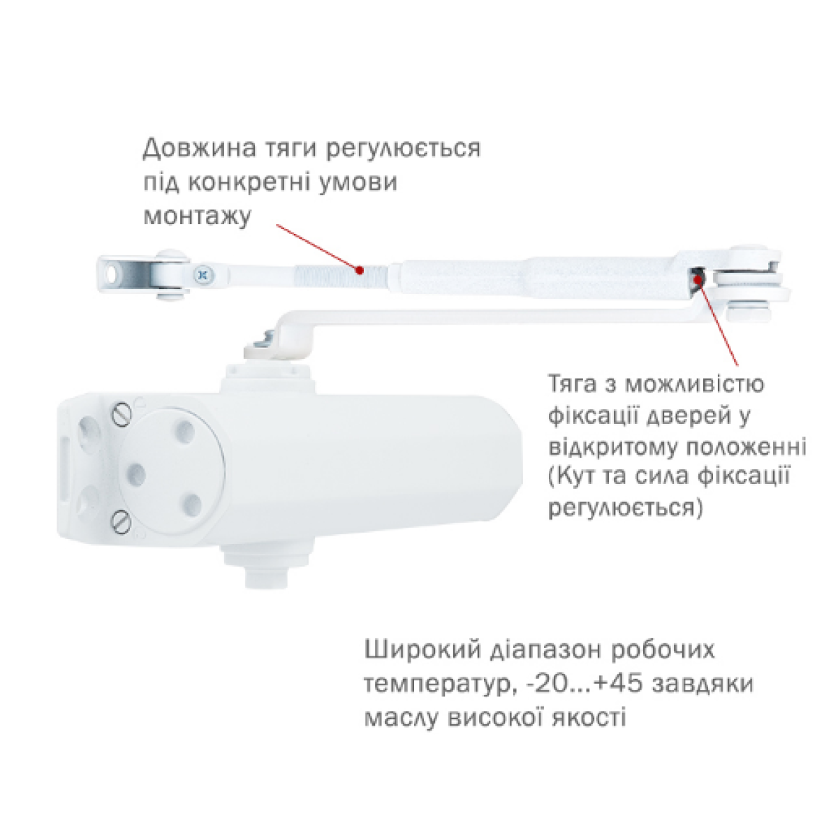 В комплекте тяга с фиксацией открытого положения двери. При открывании двери к установленному углу дотягиватель работает как обычно, автоматически закрывая дверь. При открывании шире, дверь фиксируется в открытом положении.