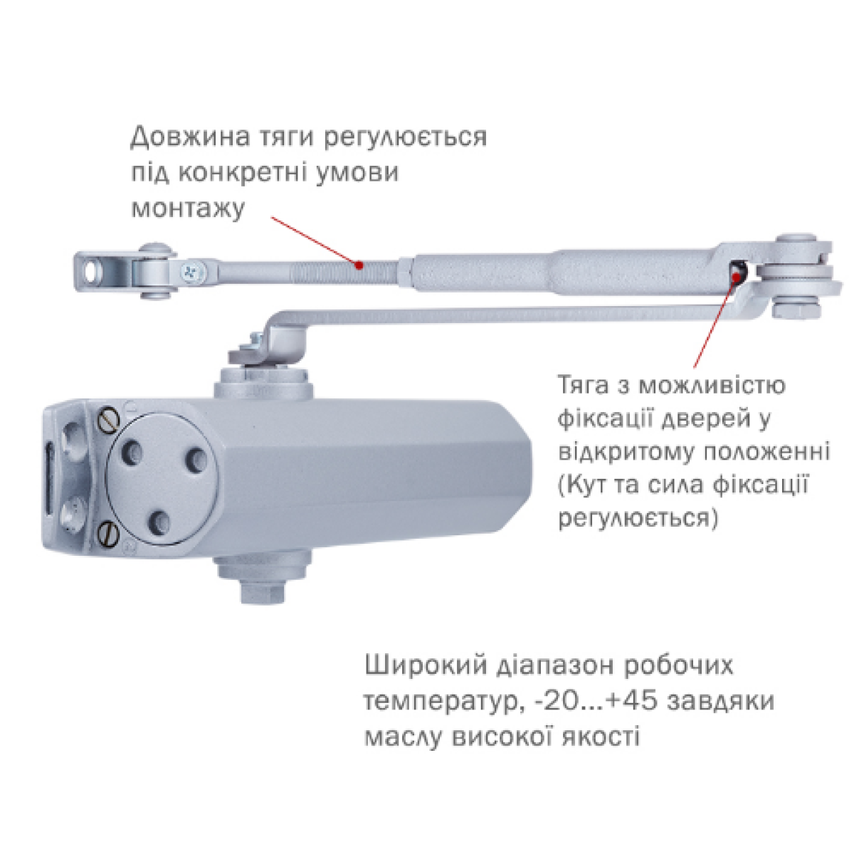 В комплекте тяга с фиксацией открытого положения двери. При открывании двери к установленному углу дотягиватель работает как обычно, автоматически закрывая дверь. При открывании шире, дверь фиксируется в открытом положении.
