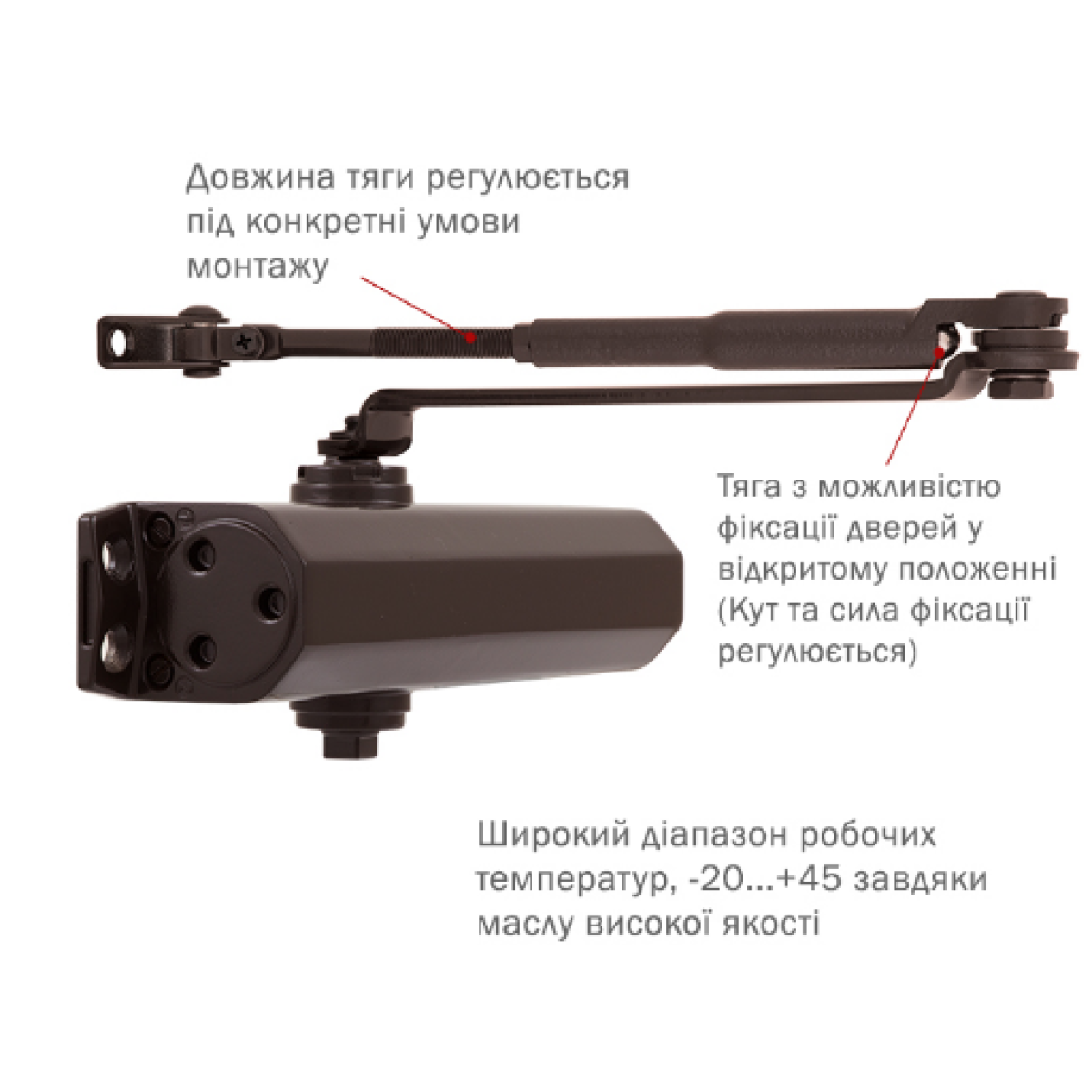 В комплекте тяга с фиксацией открытого положения двери. При открывании двери к установленному углу дотягиватель работает как обычно, автоматически закрывая дверь. При открывании шире, дверь фиксируется в открытом положении.