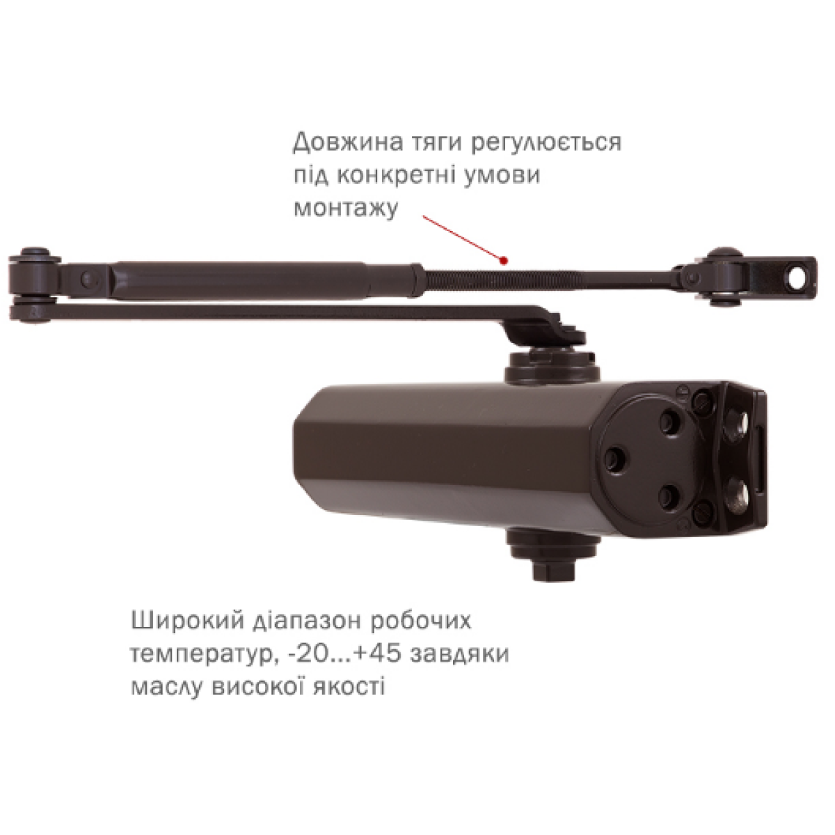 Комплектация: доводчик, декоративная крышка, комплект крепления, стандартная тяга.