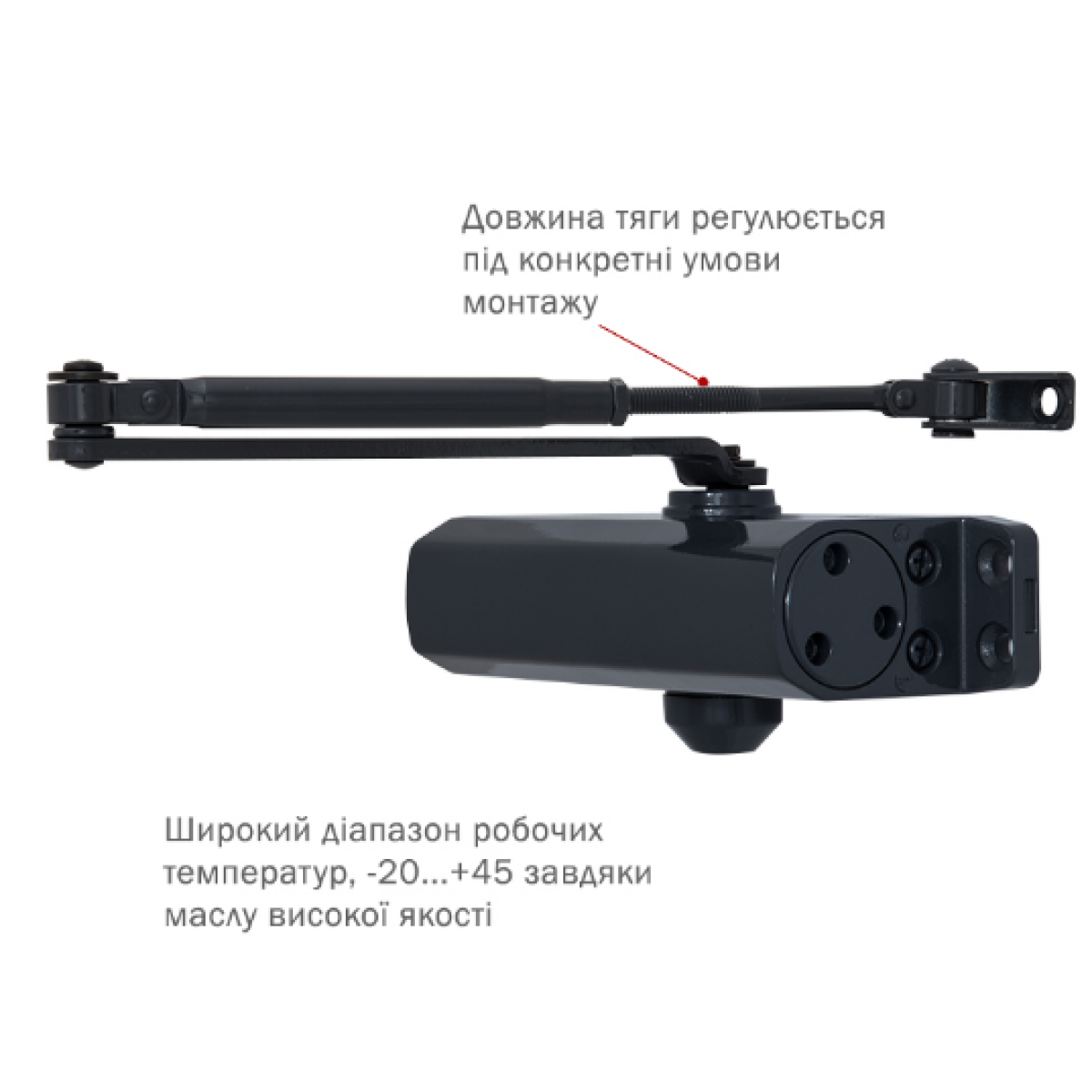 При монтаже на дверной раме со стороны закрывания во избежание самопроизвольной раскрутки винта крепления тяги к корпусу дотягивателя и, как следствие, порчи самой тяги, обязательно использовать гровер (есть в комплекте поставки) и, рекомендуется, фиксатор резьбы.