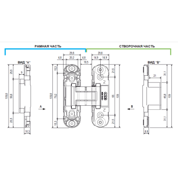 Универсальная скрытная петля с уменьшенной рамной частью до 20 мм глубиной для установки в коробку с телескопическими наличниками без подрезания соответствующей петле части наличников. Eclipse 2.0 регулируется в трех измерениях с возможностью открывания полотна до 180 градусов.