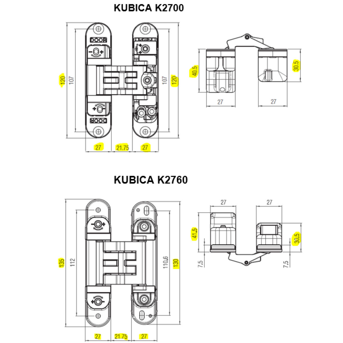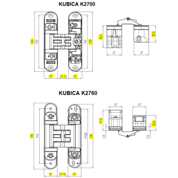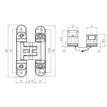 Скрытая петля Kubica Hybrid K 2760 от Krona Koblenz из высокопрочной стали и сплава ZAMAK, для межкомнатных дверей заподлицо со стеной и деревянных, стальных и алюминиевых коробок. Грузоподъемность до 60 кг с 2 петлями. Угол открывания до 180°, врезка по центру двери толщиной макс. 45 мм, толщина двери мин. 35 мм, износостойкие втулки, не требующие смазки/обслуживания, реверсивные для правой/левой двери. Трех сторонняя регулировка: по горизонтали +3/- 1,5 мм, по вертикали +/- 2,5 мм, по плоскости +/- 1 мм.