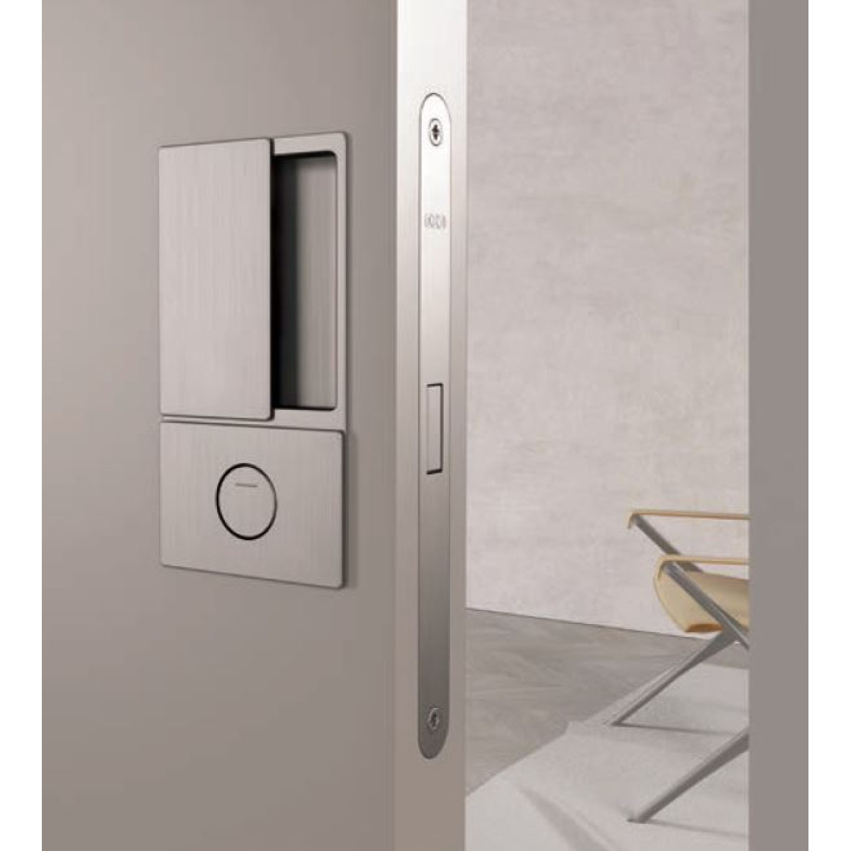 Врезной замок с запатентованным магнитным приводом и центральной защелкой из пластика соответствующего цвета. Санузловый привод запирает защелку, которая также выполняет роль засова, при этом оставляя свободный ход ручки.
